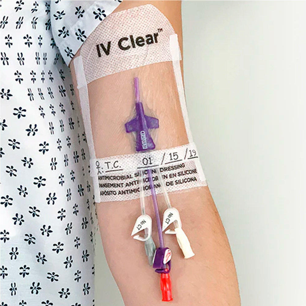 El apósito de sujeción antimicrobiano con adhesivo de silicona transparente IV Clear® protege y mantiene en óptimo estado sitios de inserción de catéteres y vías de diferentes tipos.