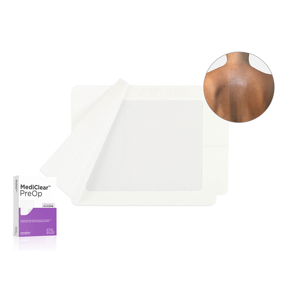 - MediClear™ PreOp es aplicado pre quirúrgicamente y se deja en la piel hasta el día de la cirugía.